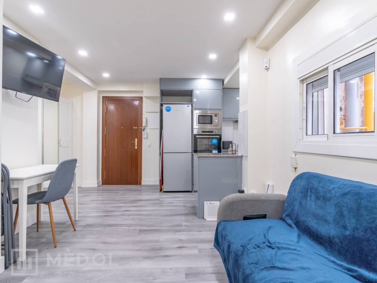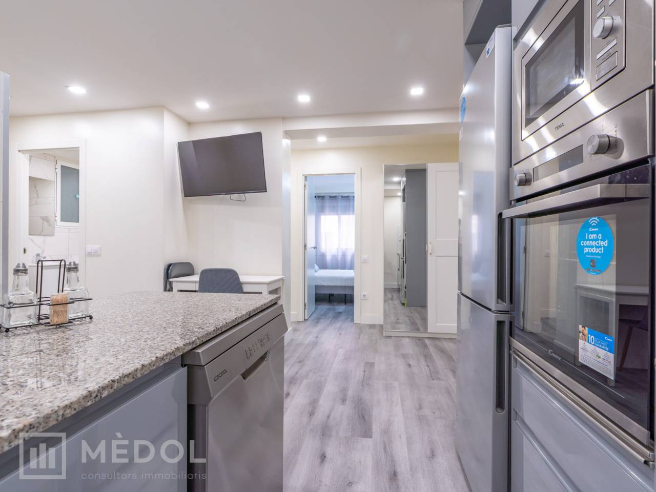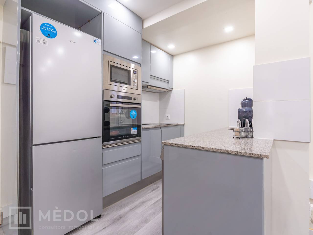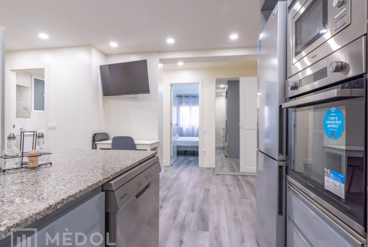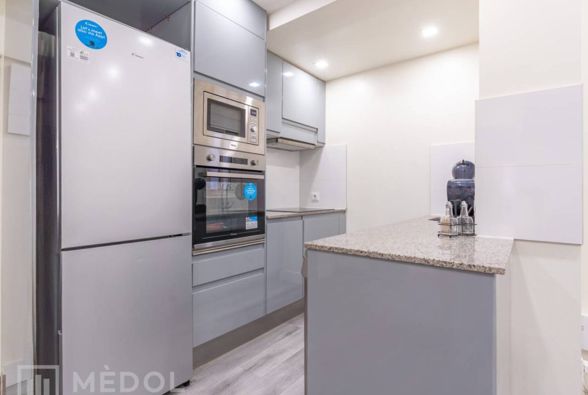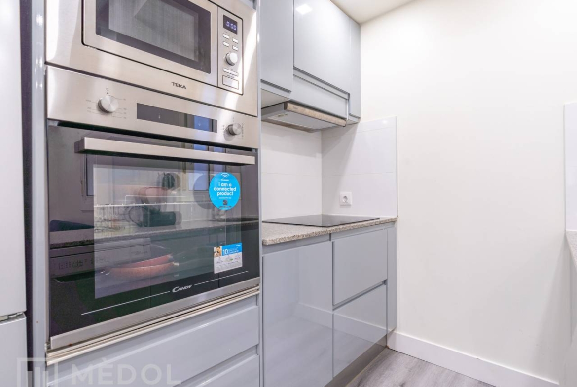 Dispone de un amplio salón comedor con cocina integrada, en concepto abierto, con una isla central que aporta estilo y practicidad. El piso esta distribuido en 2 habitaciones espaciosas con buena iluminación natural y un baño completo con ducha de diseño.