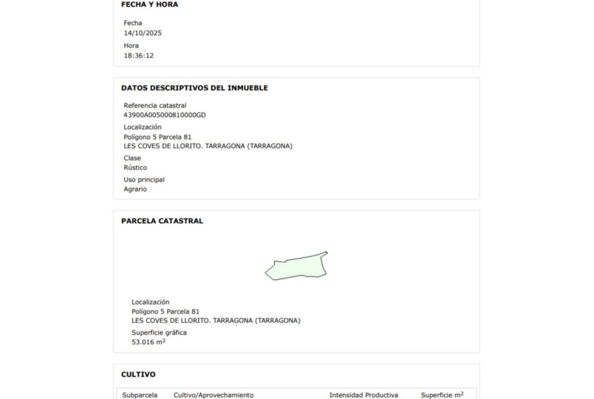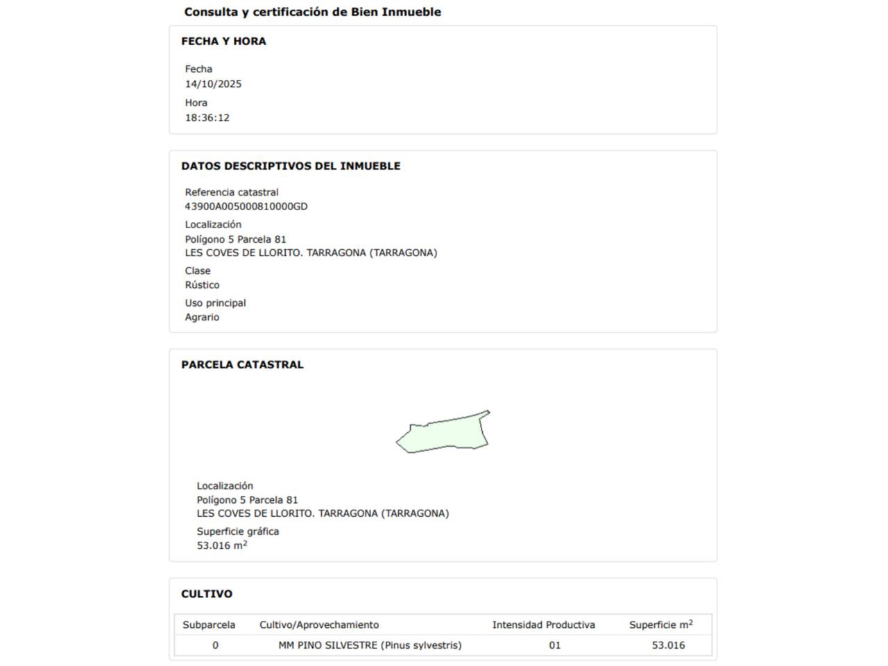 En venta finca rústica de 53.016 m² (5,3 hectáreas) situada en la zona de Les Coves de Llorito (Tarragona), en el Polígono 5, Parcela 81. De uso principal agrario y dedicada actualmente a pinar maderable, esta propiedad ofrece múltiples posibilidades: desde la explotación forestal o la inversión en rendimiento de madera, hasta su uso como espacio de ocio, desconexión o actividades en contacto con la naturaleza. Ubicada en un entorno natural privilegiado y de fácil acceso, es una oportunidad ideal tanto para particulares como para empresas del sector forestal o proyectos relacionados con el medio ambiente. Para más información o visitas, no dudes en contactarnos.